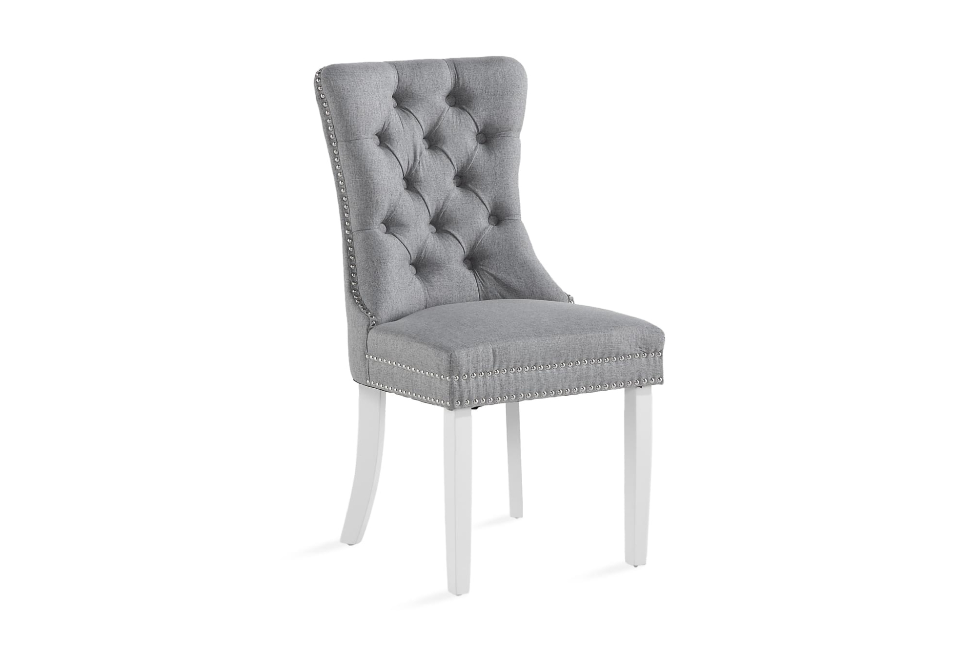 BEMÆRK, AT DENNE STOL KUN SÆLGES PARVIS OG DER SKAL DERFOR BESTILLES 2, 4 ELLER 6 STK. Bergviken spisebordsstol er en stilfuld og moderne spisestuestol i gråt stof og træben. Stolen har fine detaljer med mønster i stoffet og møbelsum langs kanterne. Spise
