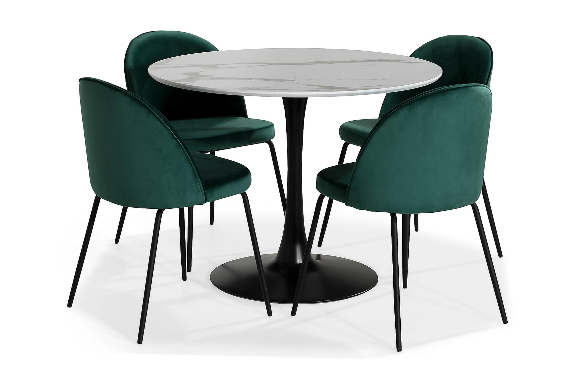 Caitly er et moderne og elegant sæt, bestående af et spisebord med fire tilhørende spisebordsstole beklædt i velour. Med de smukke detaljer i dette spisebord, vil det være en skøn tilføjelse til dit hjem. Spisebordet har en højde på 75 cm og en diameter p