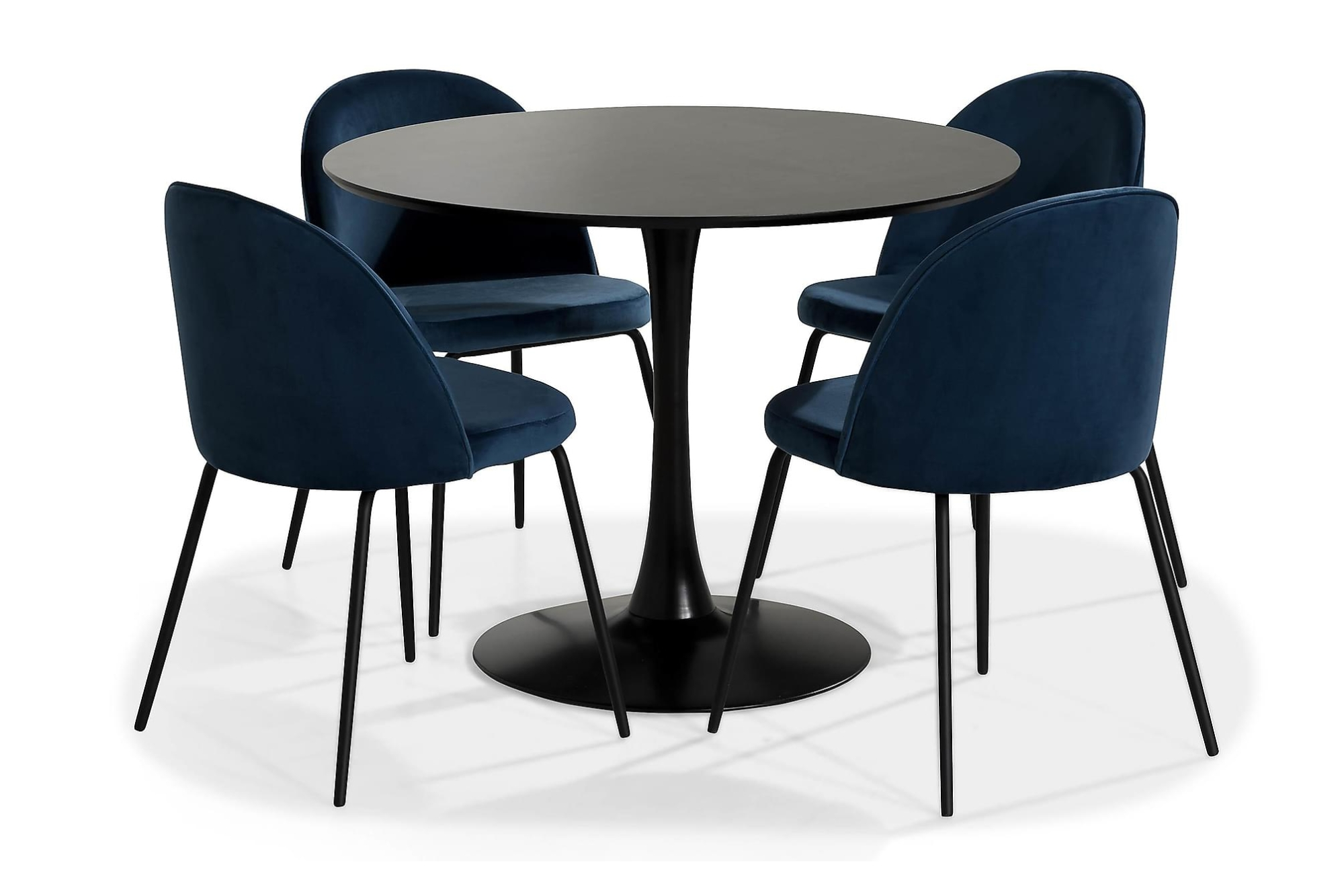 Caitly er et moderne og elegant sæt, bestående af et spisebord med fire tilhørende spisebordsstole beklædt i velour. Med de smukke detaljer i dette spisebord, vil det være en skøn tilføjelse til dit hjem. Spisebordet har en højde på 75 cm og en diameter p