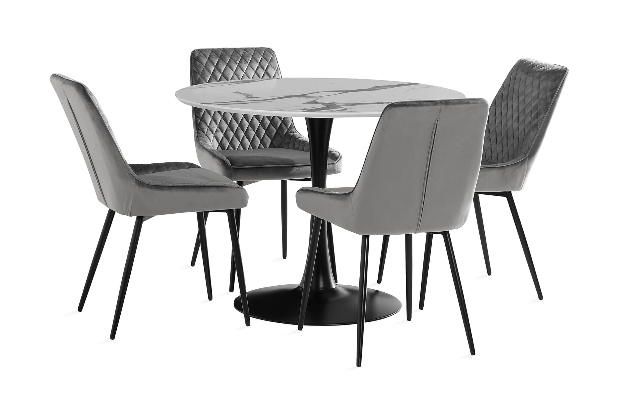 Caitly er et moderne og elegant spisebordssæt, bestående af et rundt spisebord med fire tilhørende spisebordsstole beklædt i gråt stof. Med sin enkelhed, vil dette spisebordssæt være en skøn tilføjelse til dit hjem. Spisebordet har en højde på 75 cm og en