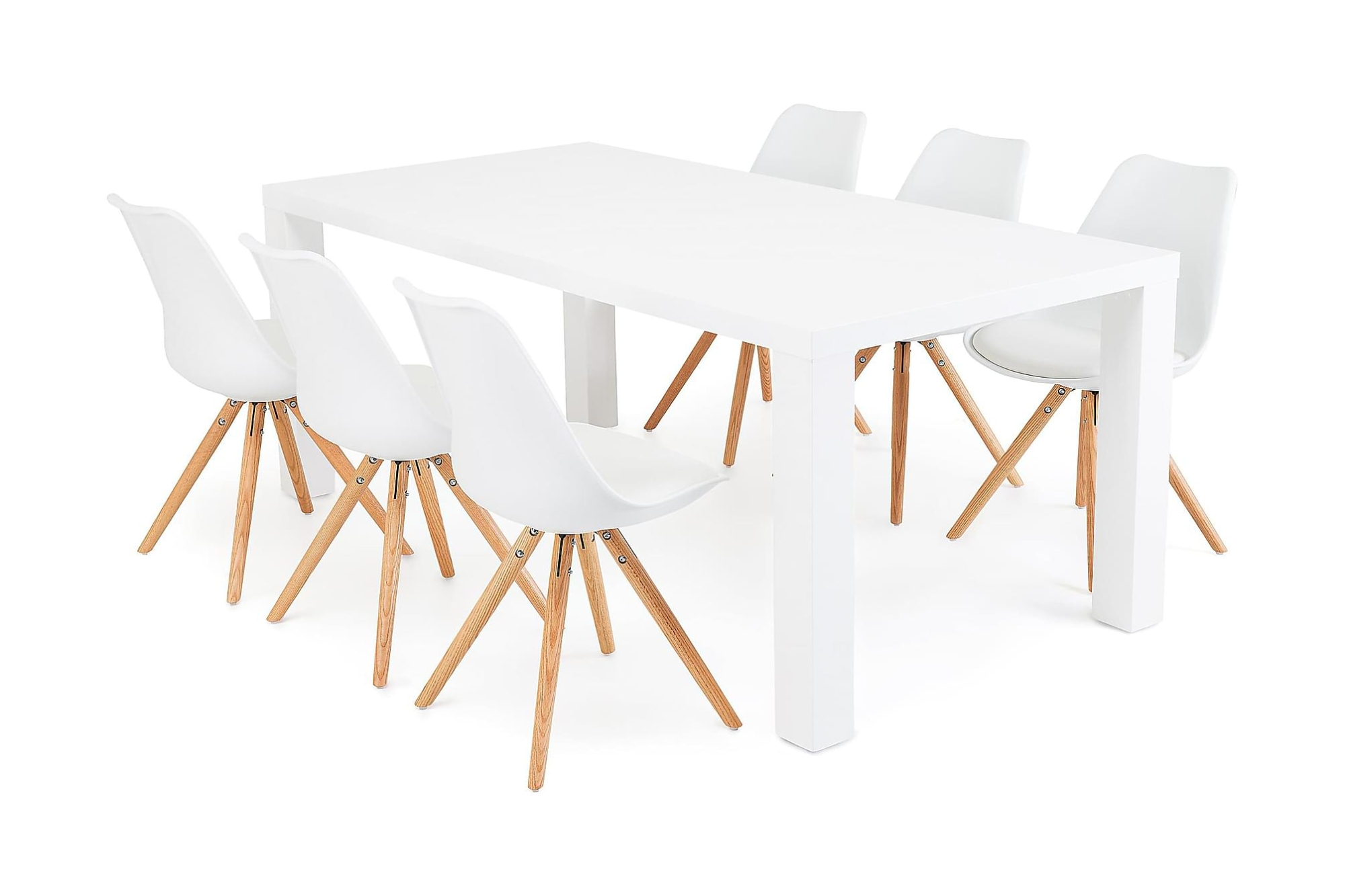 En lyst og stilfuldt spisebordssæt, der let byder ind til hyggelige middage. Cibus spisebord i hvid højglans lak og Forums spisestole skaber en stilfuld kombination. Forum spisestol har høj siddekomfort og et formstøbt sæde i hvid PU. Stolens ben er frems