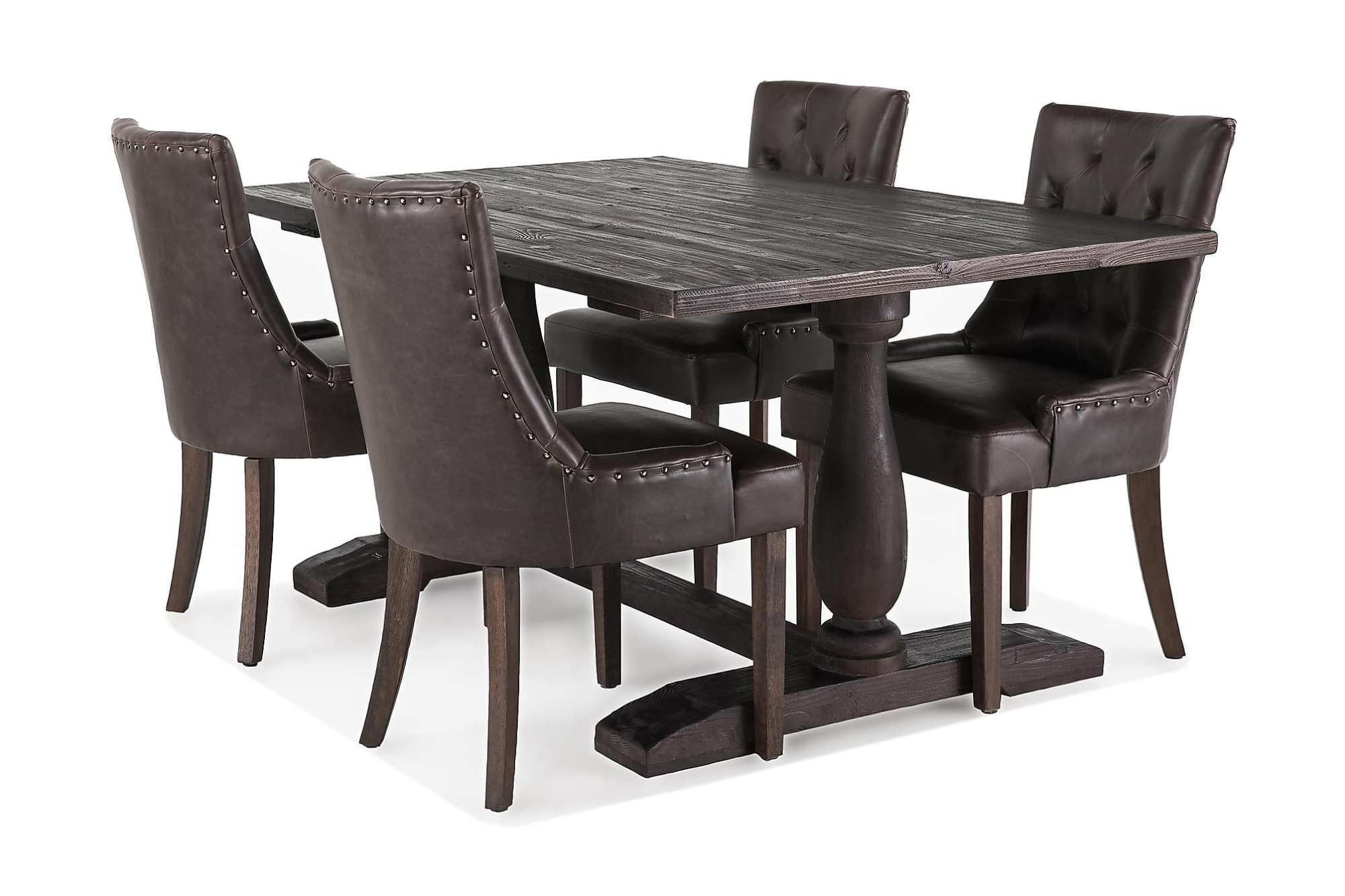 Dijon spisebordssæt er et rustikt og charmerende sæt, bestående af et aflangt spisebord i vintage grantræ og fire tilhørende spisebordsstole i kunstlæder. Små mærker og fordybninger på op til 5-6 mm er en naturlig del af håndværket og møblets design. Diss