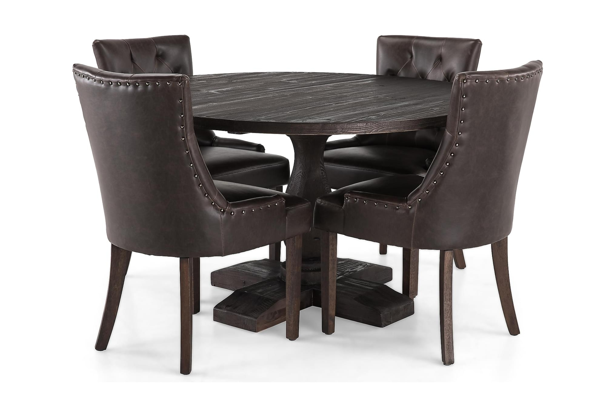 Dijon spisebordssæt er et rustikt og charmerende sæt, bestående af et aflangt spisebord i vintage grantræ og fire tilhørende spisebordsstole i kunstlæder. Små mærker og fordybninger på op til 5-6 mm er en naturlig del af håndværket og møblets design. Diss