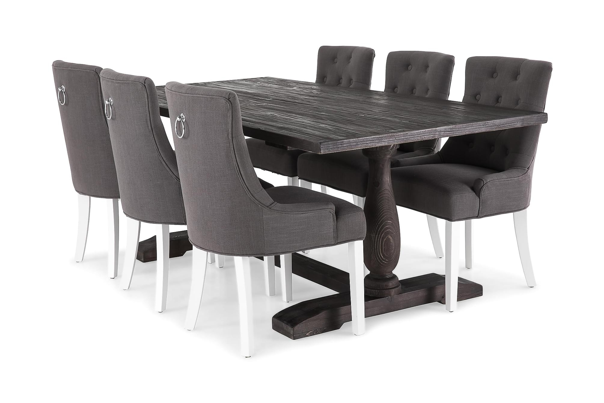 Dijon spisebordssæt er et rustikt og charmerende sæt, bestående af et aflangt spisebord i vintage grantræ og seks tilhørende spisebordsstole i sort kunstlæder. Små mærker og fordybninger på op til 5-6 mm er en naturlig del af håndværket og møblets design.