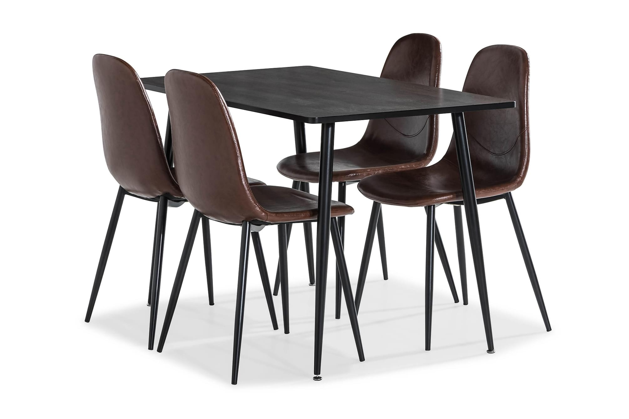 Indian er et stilfuldt og tidløst spisebordssæt med fire spisebordsstole i brun kunstlæder. Marcelen spisebordet har en højde på 75 cm, en dybde på 70 cm og en længde på 120 cm. Nibe spisebordsstolene har en højde på 88 cm, en dybde på 50 cm og en længde