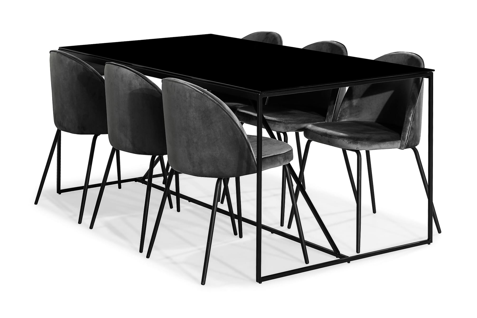 Indy Spisebordssæt Med 6 Felipe Stole (Grå Velour), Sort