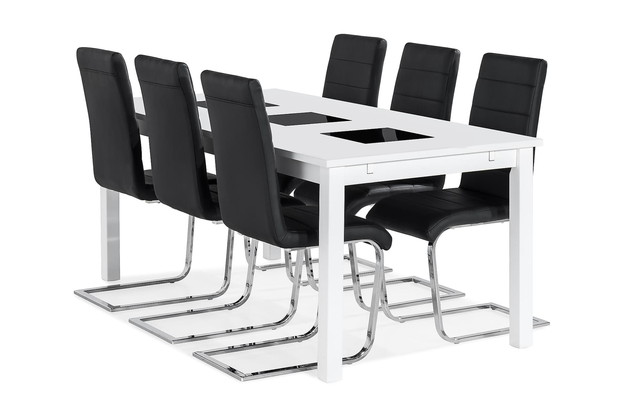 Jasmin spisebordssæt er et moderne og klassisk sæt bestående af et aflangt spisebord og seks tilhørende stole i sort kunstlæder. I en enkel og elegant farvekombination af sort og hvid, vil dette spisebordssæt være et stilsikkert valg til dit hjem. Spisebo