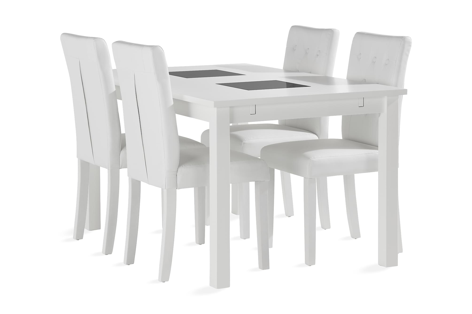 Jasmin spisebordssæt er et moderne og klassisk sæt bestående af et klassisk spisebord og fire tilhørende stole med læderlook. I en enkel og elegant farvekombination af sort og krom, vil dette spisebordssæt være et stilsikkert valg til dit hjem. Spiseborde