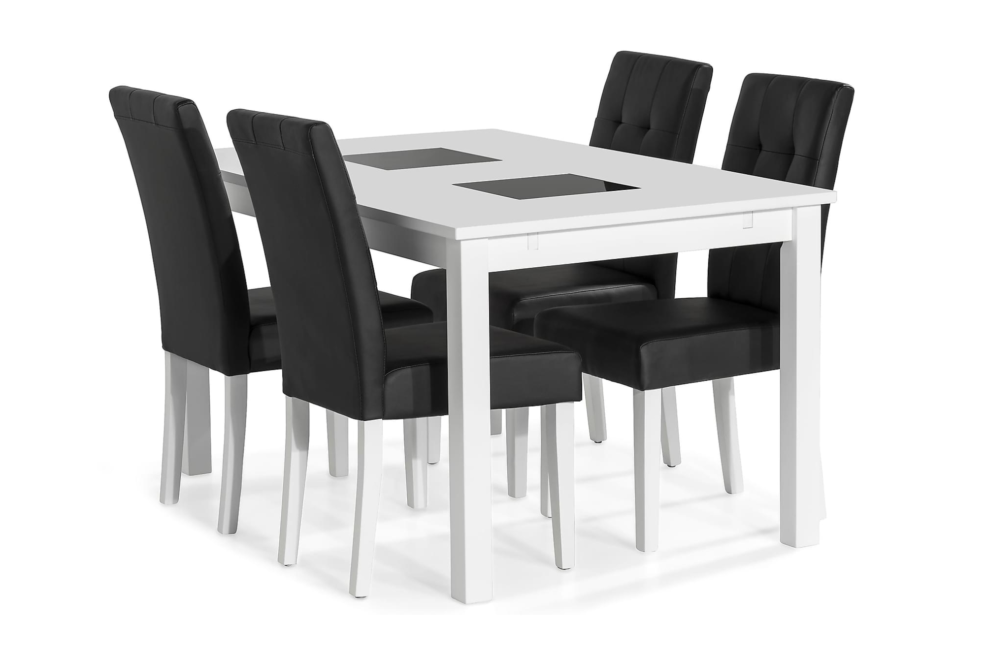 Jasmin spisebordssæt er et moderne og klassisk sæt bestående af et aflangt spisebord og fire tilhørende stole i sort kunstlæder. I en enkel og elegant farvekombination af sort og hvid, vil dette spisebordssæt være et stilsikkert valg til dit hjem. Spisebo