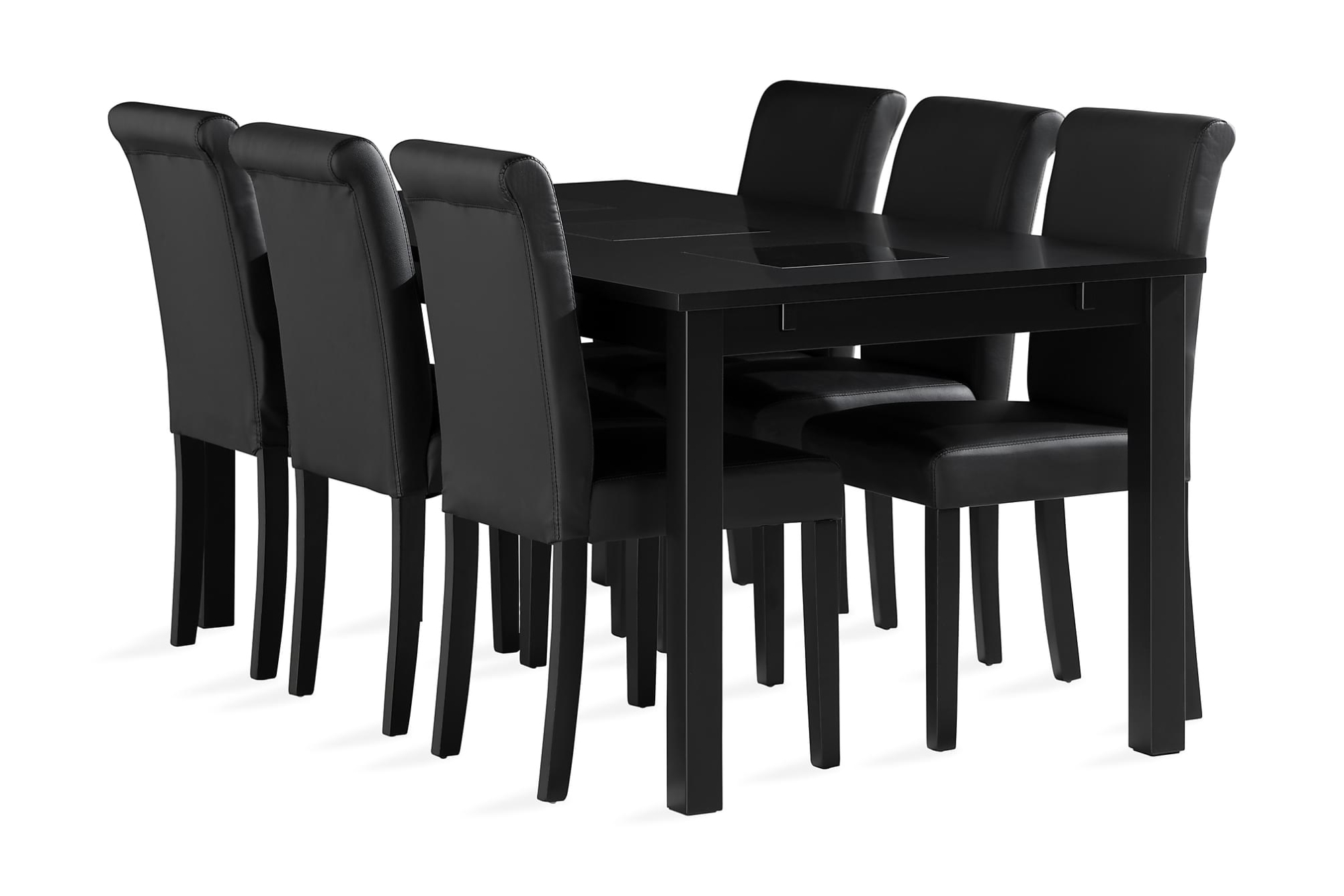 Jasmin spisebordssæt er et moderne og klassisk sæt bestående af et aflangt spisebord og seks tilhørende spisebordsstole. I en enkel og elegant farvekombination, vil dette spisebordssæt være et stilsikkert valg til dit hjem. Spisebordet har en højde på 76
