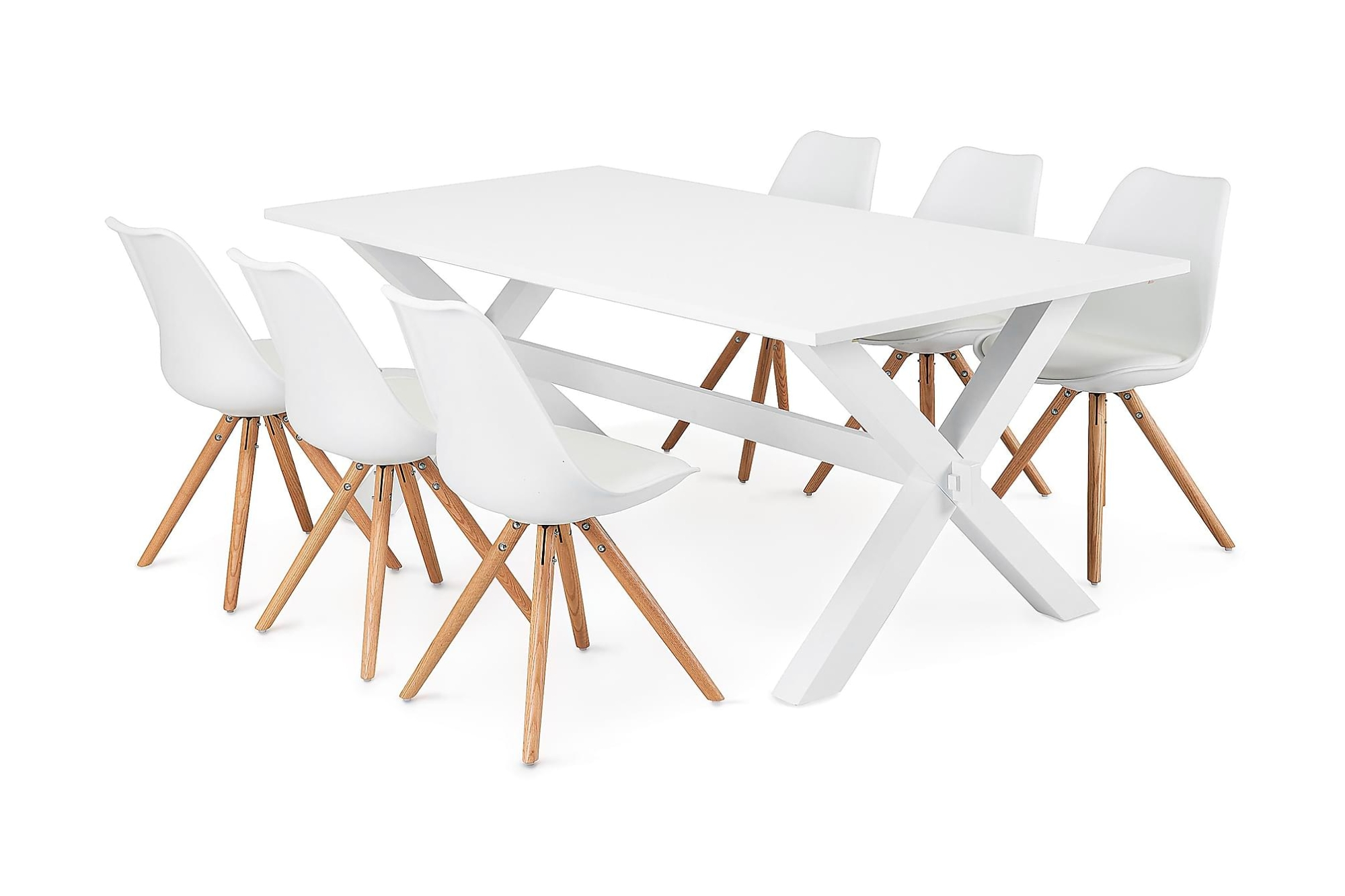 Linnea spisebordssæt er et indbydende og stilrent sæt med en følelse af vintage. Spisebordet har krydsben og en hvidlakeret overflade, som er let at tørre af samt holde ren. Spisebordssættet består af et spisebord og seks tilhørende spisebordsstole. Spise