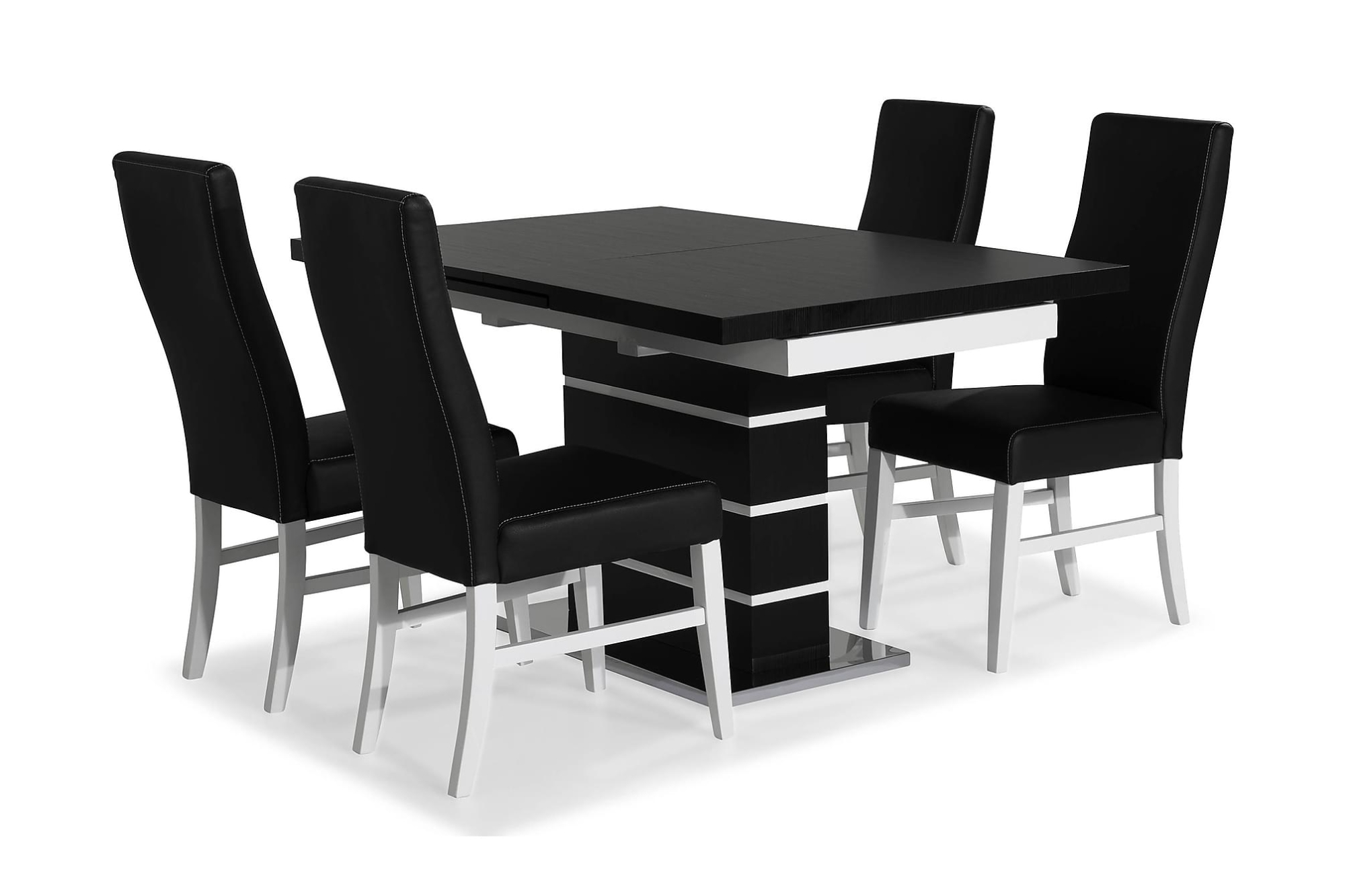 Macahan spisebordssæt er et moderne og klassisk spisebordssæt, som består af et aflangt spisebord med fire tilhørende spisebordsstole i sort kunstlæder. Spisebordet har en højde på 75 cm, en dybde på 90 cm og en længde på 140 cm. Spisebordet kan forlænges