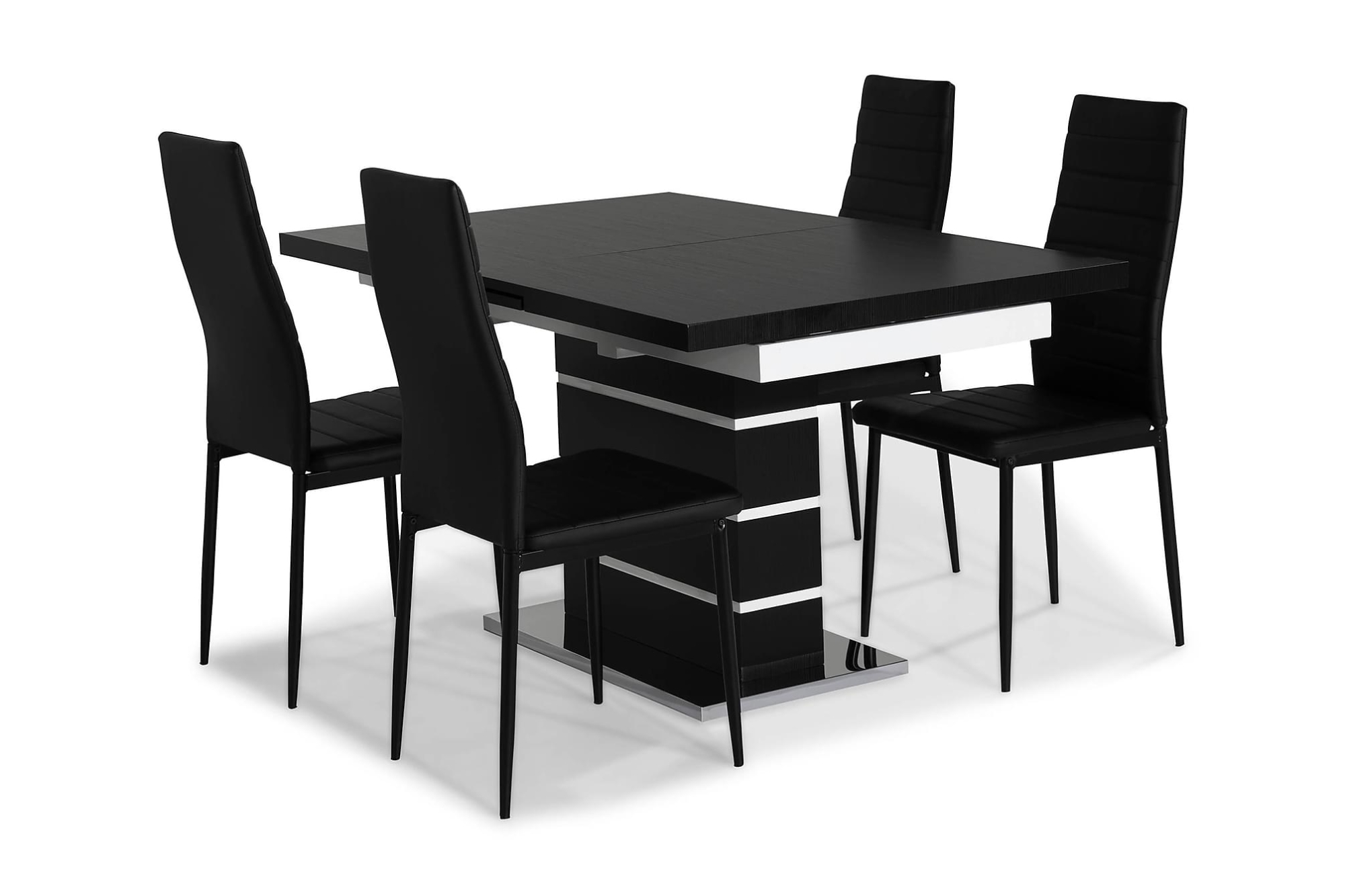 Macahan spisebordssæt er et moderne og klassisk spisebordssæt, som består af et aflangt spisebord med fire tilhørende spisebordsstole i sort kunstlæder. Spisebordet har en højde på 75 cm, en dybde på 90 cm og en længde på 140 cm. Spisebordet kan forlænges