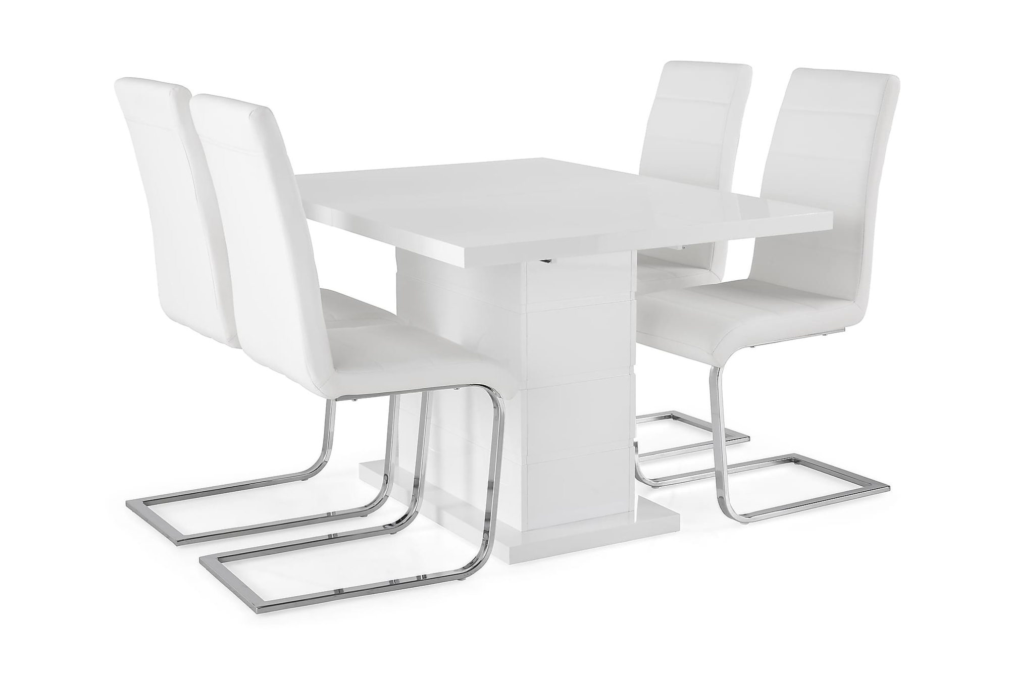 Ratliff spisebordssæt er et moderne og stilfuldt spisebordssæt, som passer ind i de fleste hjem. Takket være den praktiske tillægsplade får I plads til mange. Både bordet og stolene er utroligt nemme at vedligeholde. Ratliff er et hvidt spisebord i modern