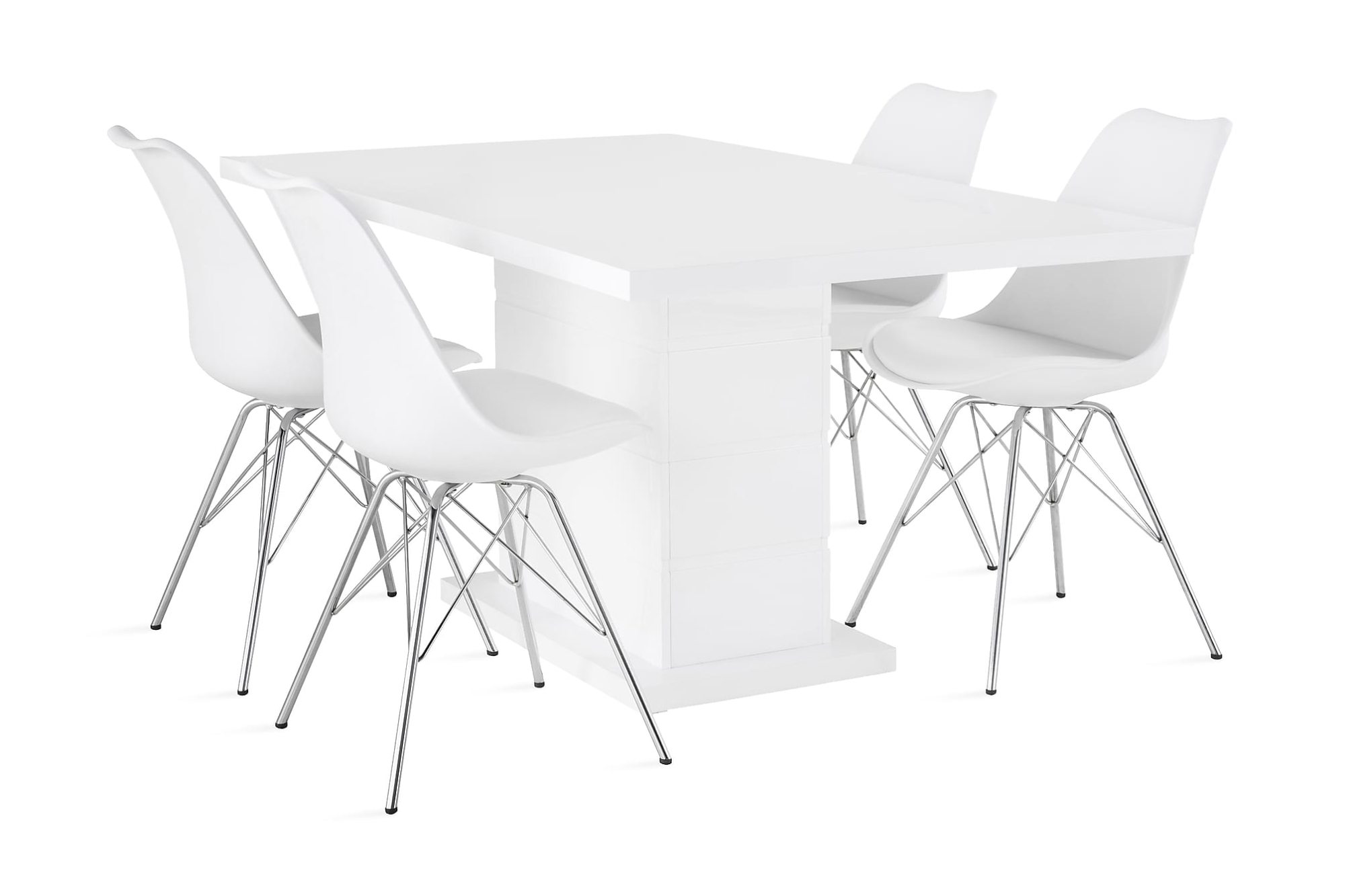 Ratliff spisebordssæt er et moderne og stilfuldt spisebordssæt, som passer ind i de fleste hjem. Både bordet og stolene er utroligt nemme at vedligeholde. Ratliff er et hvidt spisebord i moderne stil. Den blanke overflade er nem at vedligeholde, og stelle