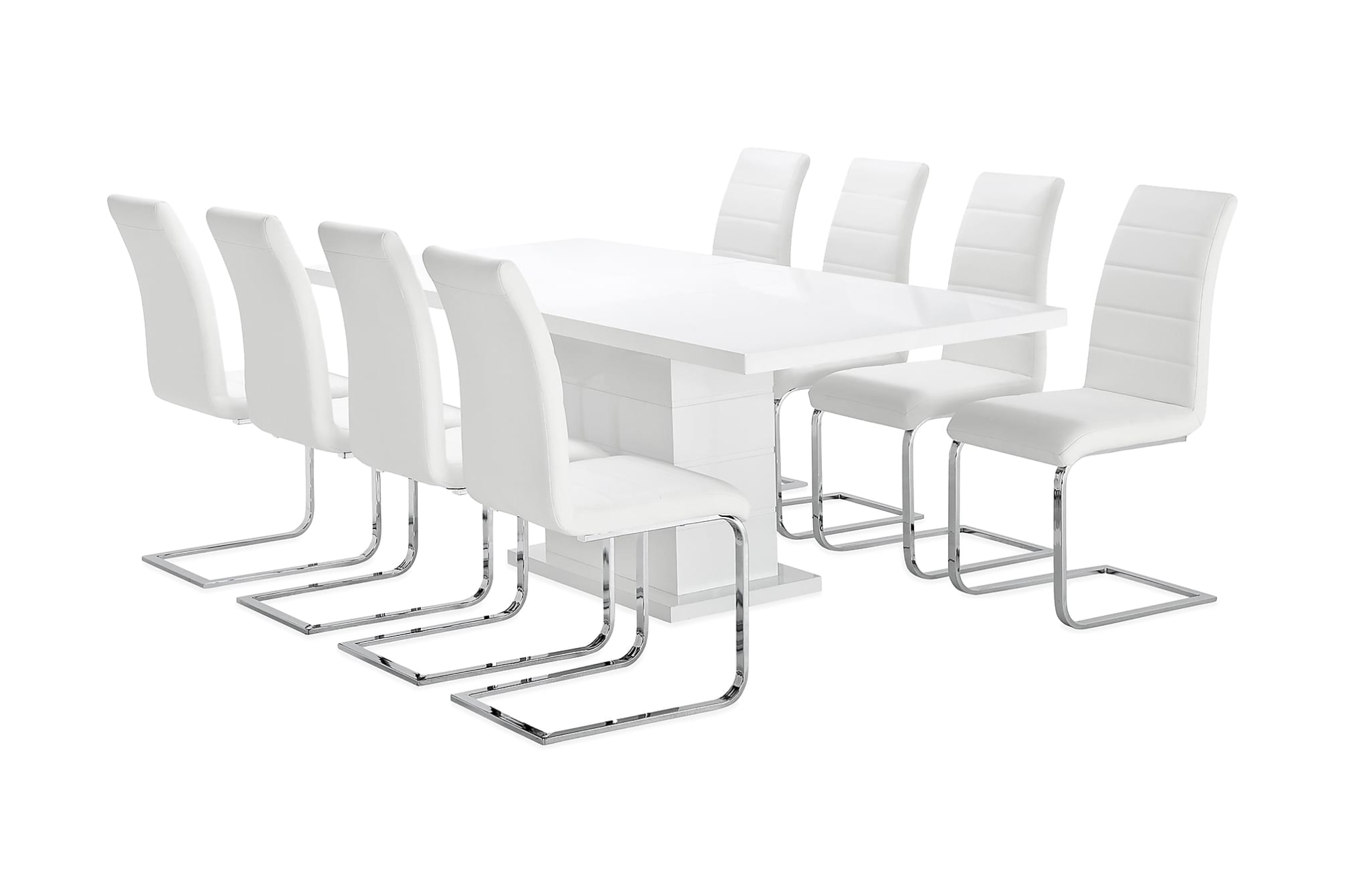 Ratliff spisebordssæt er et moderne og stilfuldt spisebordssæt, som passer ind i de fleste hjem. Takket være den praktiske tillægsplade får I plads til mange. Både bordet og stolene er utroligt nemme at vedligeholde. Ratliff er et hvidt spisebord i modern