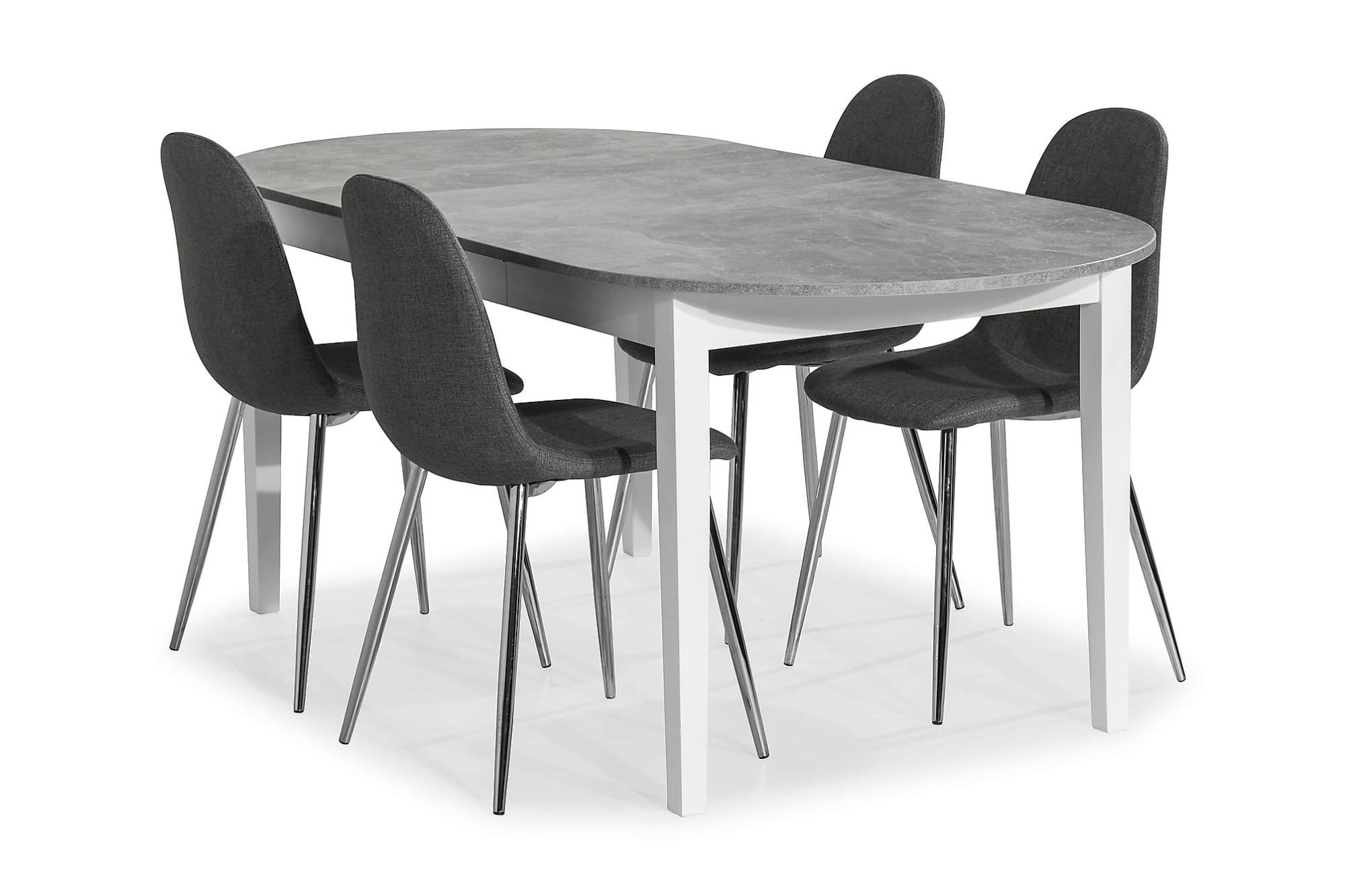 Romeo spisebord er et enkelt og tidløst spisebord med et hvidt stel og en bordplade med gråt betonlook. Der medfølger fire skønne spisebordsstole. Spisebordet har en længde på 150 cm, en dybde på 90 cm og en højde på 75 cm. Spisebordsstolene har en længde