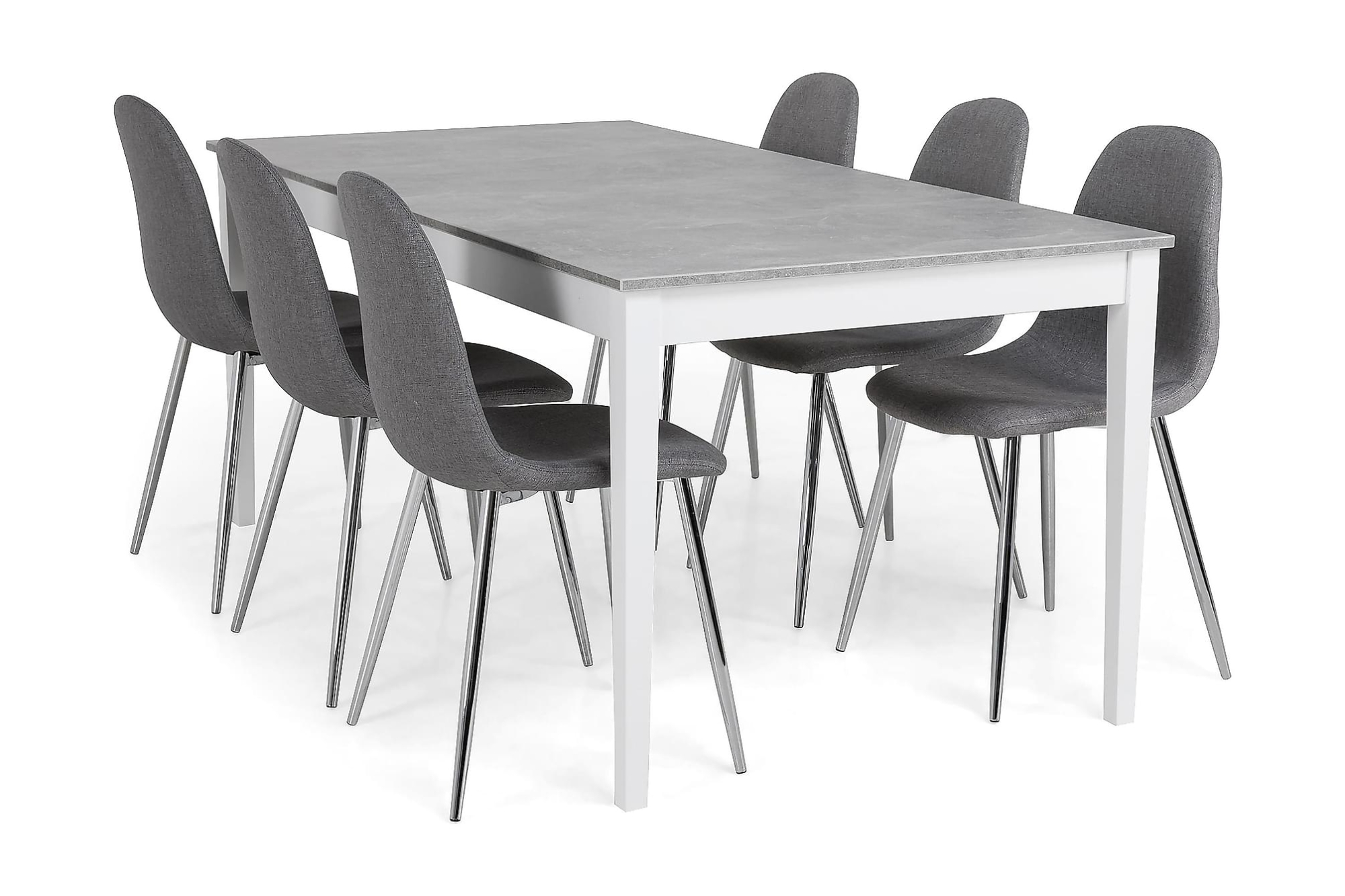 Romeo spisebord er et enkelt og tidløst spisebord med et hvidt stel og en bordplade med gråt betonlook. Der medfølger seks skønne spisebordsstole. Spisebordet har en længde på 180 cm, en dybde på 90 cm og en højde på 73,8 cm. Spisebordsstolene har en læng