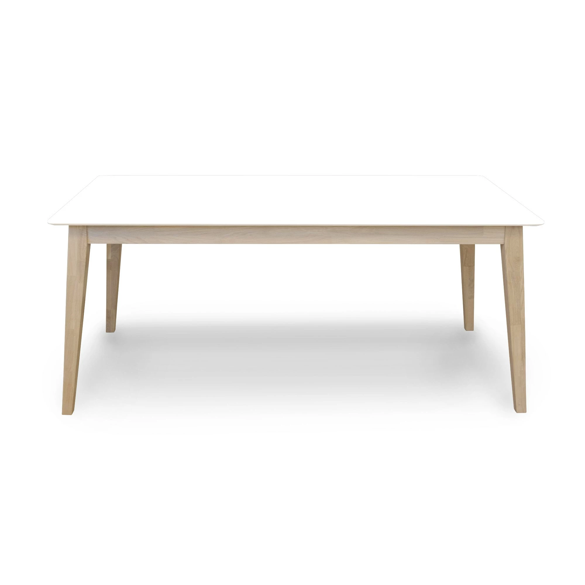 Vi er helt vilde med vores Stockholm-serie. Massive egetræsmøbler kan altså bare noget helt særligt. Her ser du vores flotte og klassiske spisebord i massiv hvidolieret egetræ med bordplade i hvid højtrykslaminat. Bordet er forberedt til to tillægsplader.