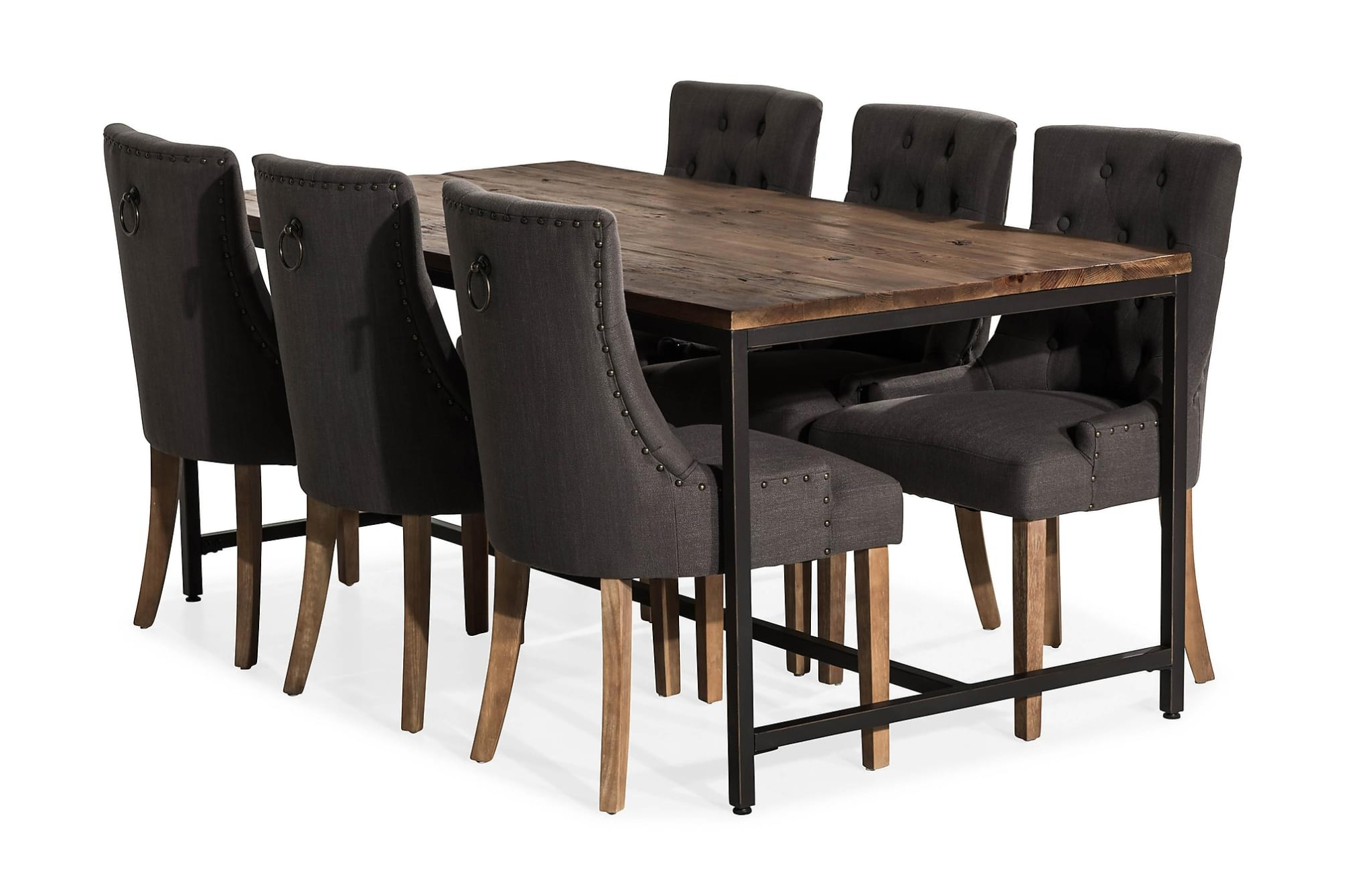 Wilmer spisebordssæt passer rigtig godt ind i det moderne og rustikke hjem. Spisebordet har et metalstel og en bordplade af voksbehandlet elm. Bordpladen er et smukt håndværk, som er fremstillet af over 100 år gamle døre og møbler, som med tiden har givet